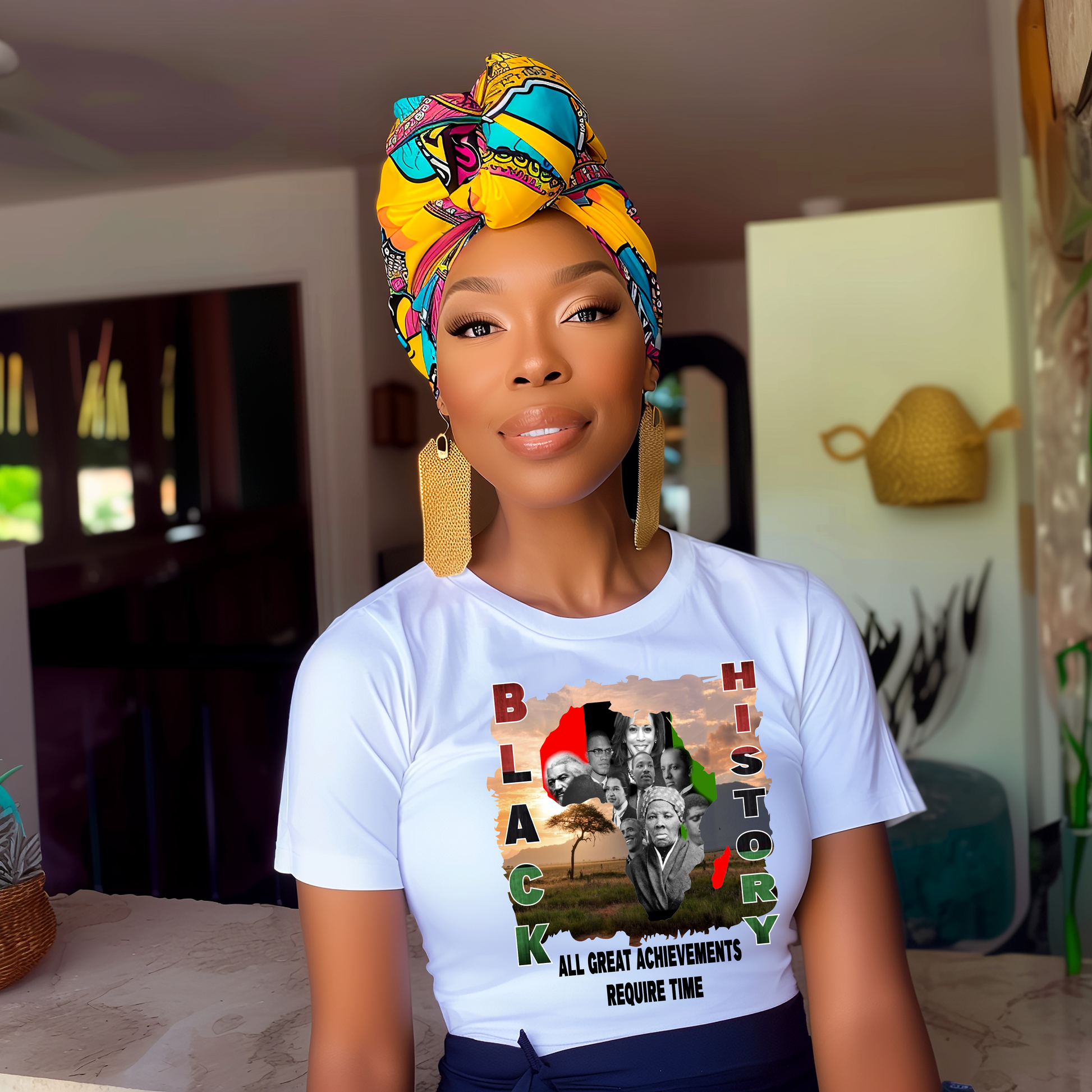 Celebrate the visionaries who changed the world with this striking black history shirt. Featuring powerful imagery of influential figures who shaped our past, this piece honors their legacies and contributions. The meaningful caption "All Great Achievements Require Time" serves as a daily reminder of patience, perseverance, and the importance of recognizing those who paved the way. Perfect for making a statement while supporting important conversations about history and progress. A wardrobe essential that combines style with substance.