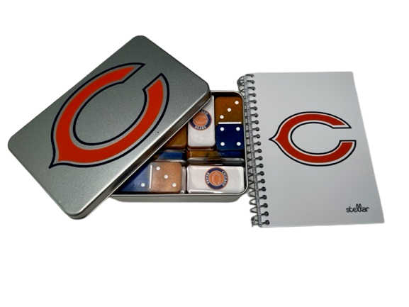 Set comes with: Dominoes with decal, storage container, domino care card, score book
